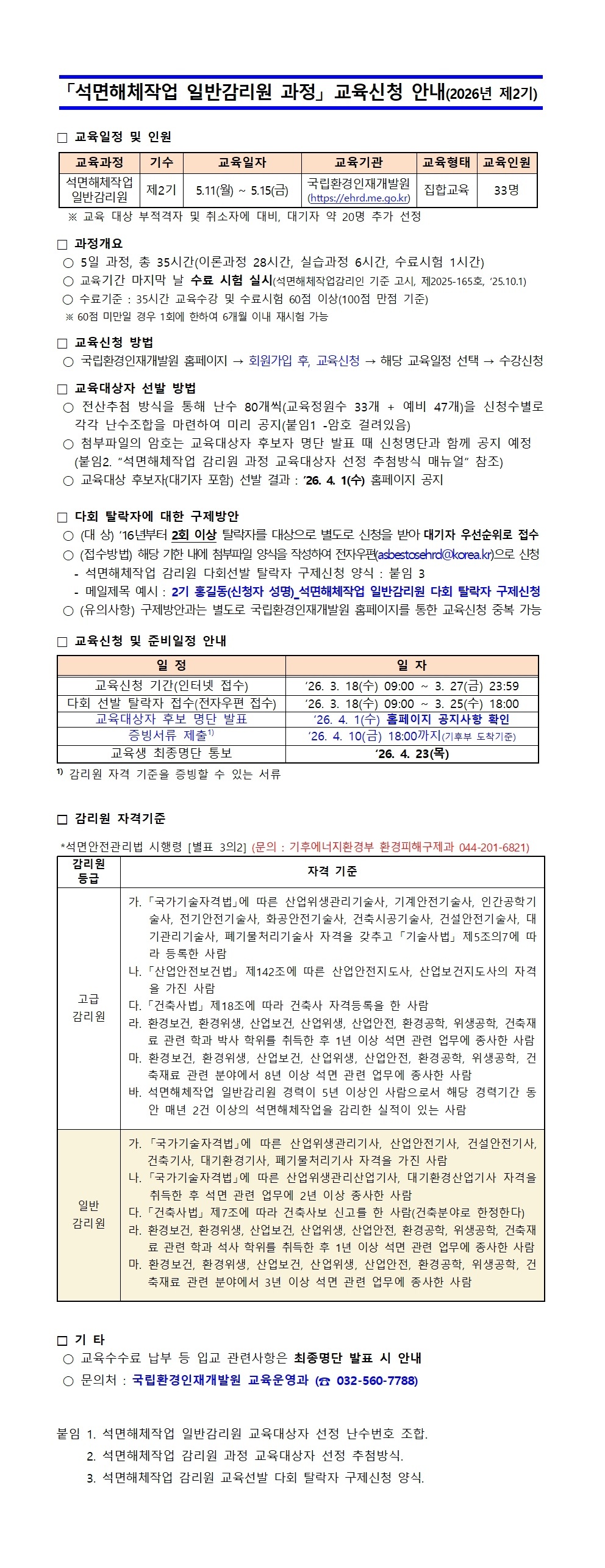 2026년 제2기(5월) 석면해체작업 일반감리원 교육신청 안내