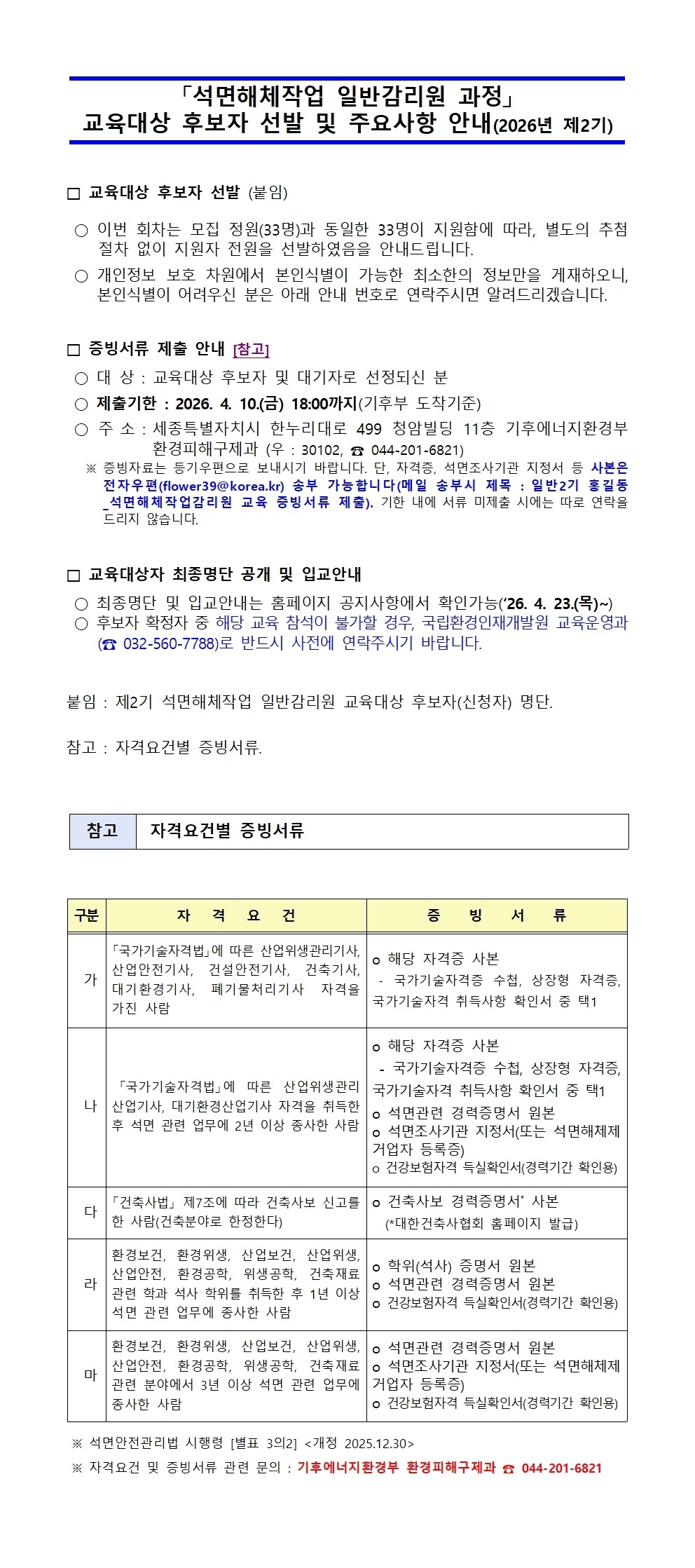 2026년 제2기(5월) 석면해체작업 일반감리원 교육대상 후보자 명단 안내