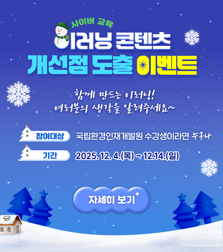 | 기타 | (사이버교육) 콘텐츠 개선점 도출 이벤트 (12.4(목)~12.14(일)) | - | 2025-12-04 | 14 | ||